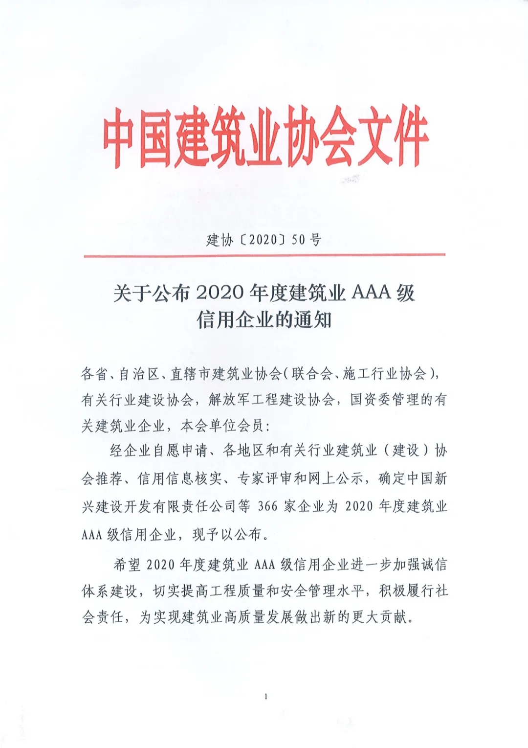 榮譽(yù)丨天恩集團(tuán)榮獲2020年度中國建筑業(yè)協(xié)會(huì)AAA級(jí)信用企業(yè)